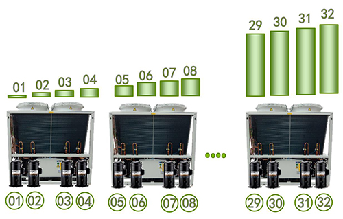 多級容量調(diào)節(jié):機(jī)組每個模塊采用多個獨(dú) 立冷媒回路設(shè)計,單機(jī)最大可實現(xiàn)0-25%-50%-75%-100%的多級容量調(diào)節(jié)。